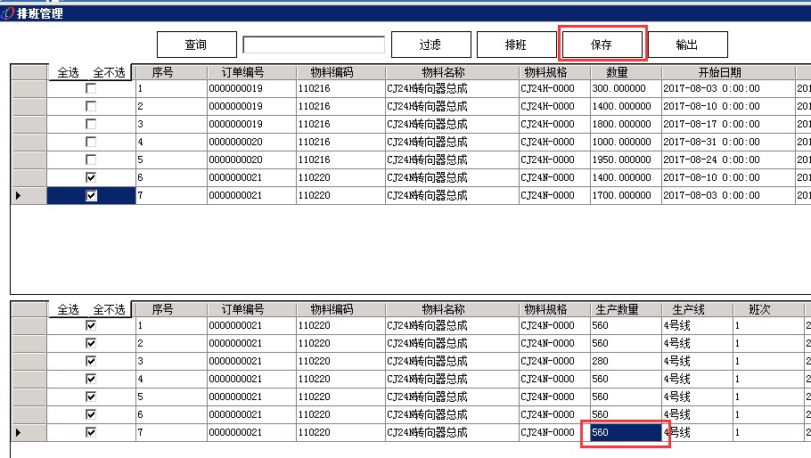 6.然后點(diǎn)擊相中需要排產(chǎn)的訂單,點(diǎn)擊進(jìn)行排班按鈕,自動(dòng)根據(jù)條件計(jì)算出的排班信息在下方顯示,可以手動(dòng)修改班產(chǎn)量、生產(chǎn)日期